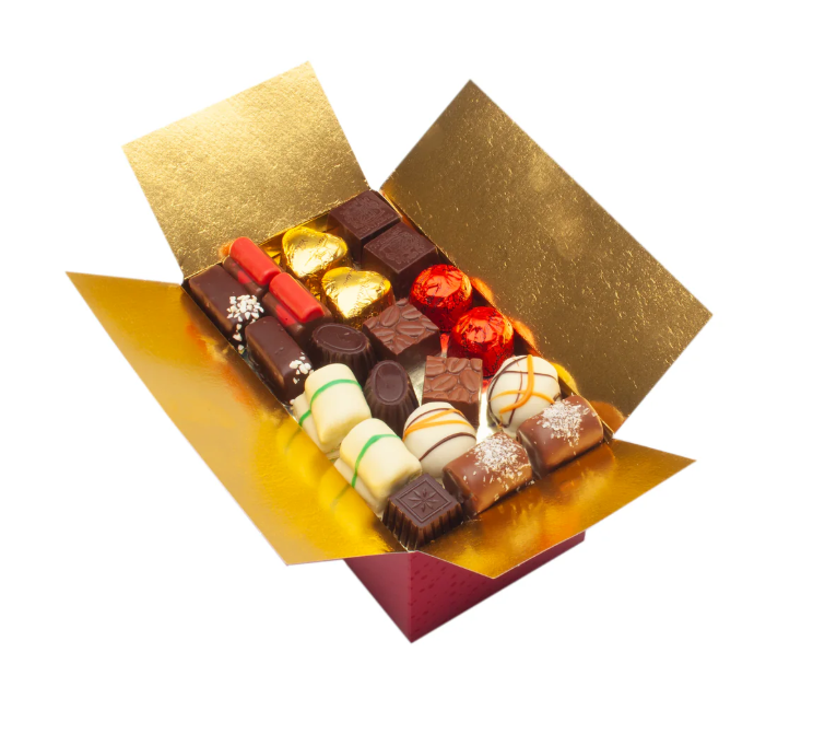 Pralinki leżą na czterech warstwach, oddzielonych delikatnymi, złotymi przekładkami. Każdą warstwę wypełniają starannie wyselekcjonowane pralinki, które zachwycają ciekawym kształtem i wyśmienitym smakiem. Czekoladki nie zawierają glutenu. Wypełnione zostały nadzieniem maślanym, orzechowym, ganache, karmelowym i owocowym.
