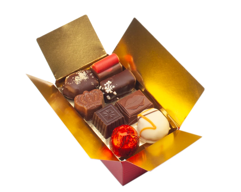 Pralinki leżą na dwóch warstwach, oddzielonych delikatną, złotą przekładką. Każda pralinka zachwyca ciekawym kształtem i wybornym smakiem. Czekoladki nie zawierają glutenu, pod warstwą pysznej czekolady kryją się nadzienia maślane, ganache, karmelowe lub owocowe.