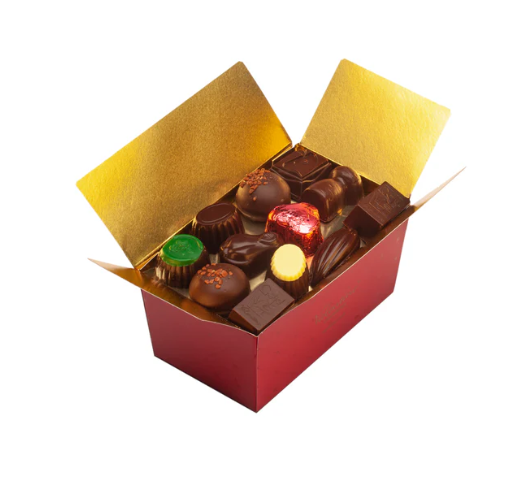 Piękna kompozycja pysznych belgijskich pralin z mieszanką ciemnych, mlecznych i białych czekoladek zamknięta w klasycznej czerwonej balotynce.