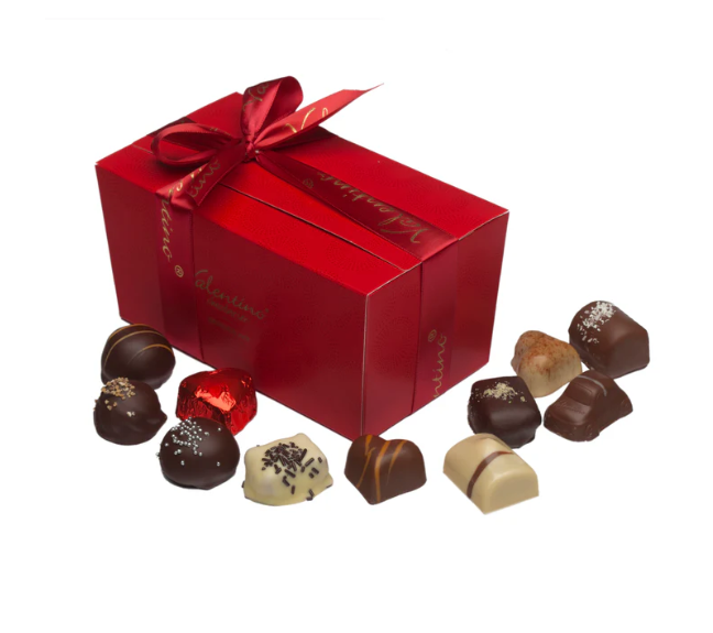 Klasyczna czerwona, prostokątna balotynka wypełniona piękną kompozycją pysznych, starannie wyselekcjonowanych belgijskich pralin z mieszanką ciemnych, mlecznych i białych czekoladek.