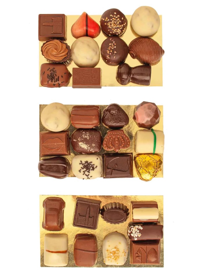 Piękna kompozycja pysznych belgijskich pralin z mieszanką ciemnych, mlecznych i białych czekoladek zamknięta w klasycznej balotynce.