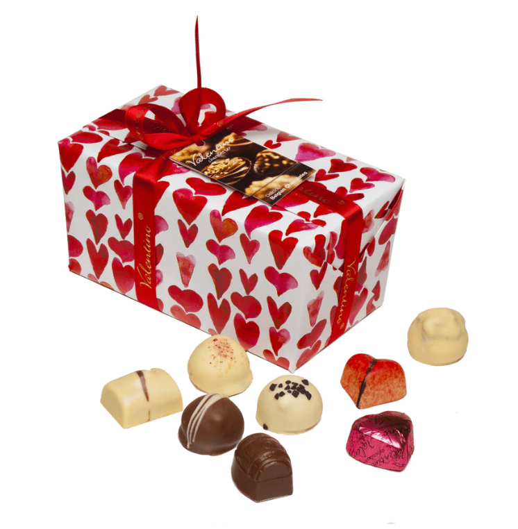 Piękna kompozycja pysznych belgijskich pralin z mieszanką ciemnych, mlecznych i białych czekoladek zamknięta w klasycznej czerwonej balotynce.