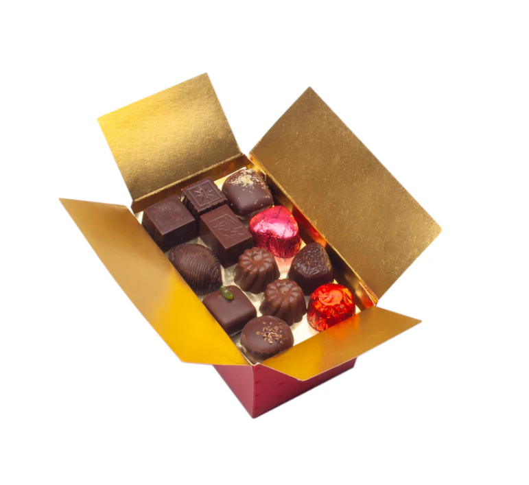 Piękna kompozycja pysznych belgijskich pralin wegańskich zamknięta w klasycznej czerwonej balotynce.