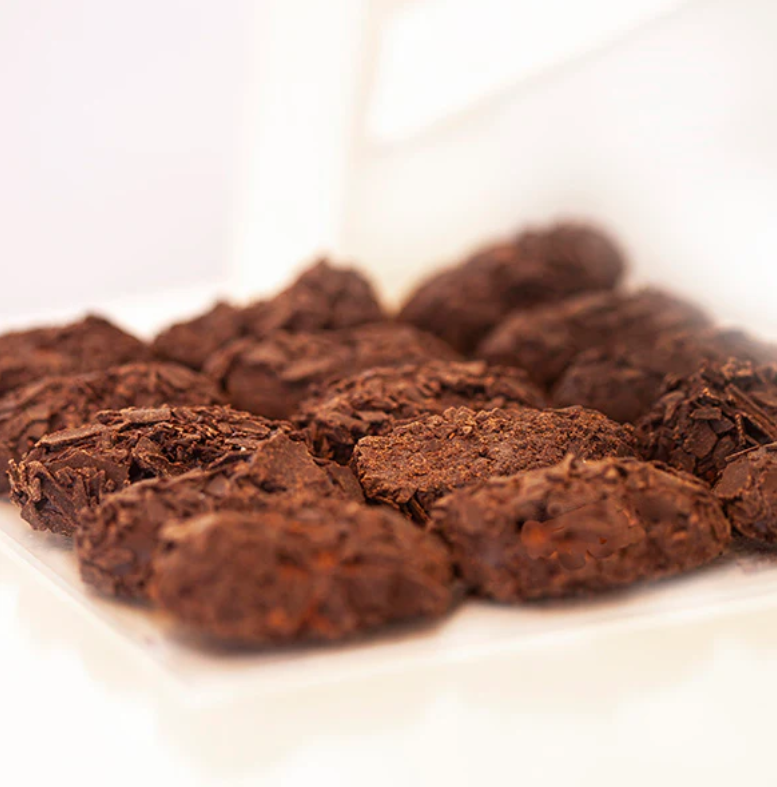 Prawdziwe belgijskie trufle wykonane z ciemnej czekolady i dodatkowo obtoczone w płatach gorzkiej czekolady.