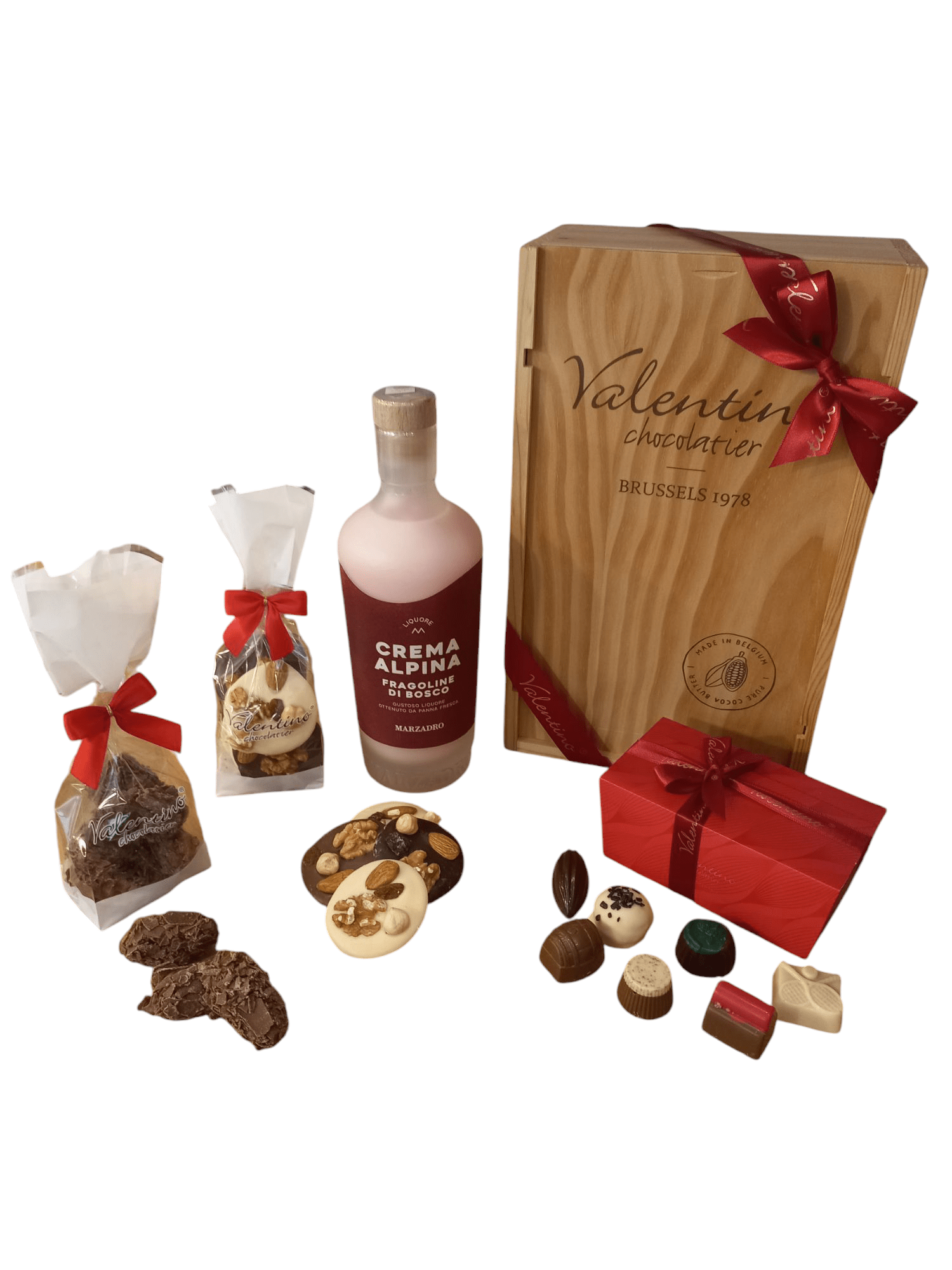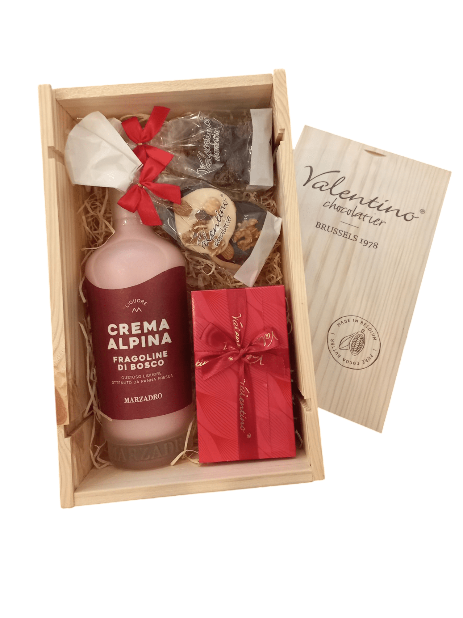 Elegancka drewniana skrzynka Valentino Chocolatier to ciekawa propozycja na oryginalny prezent dla wielbicieli belgijskich słodyczy oraz włoskich alkoholi.