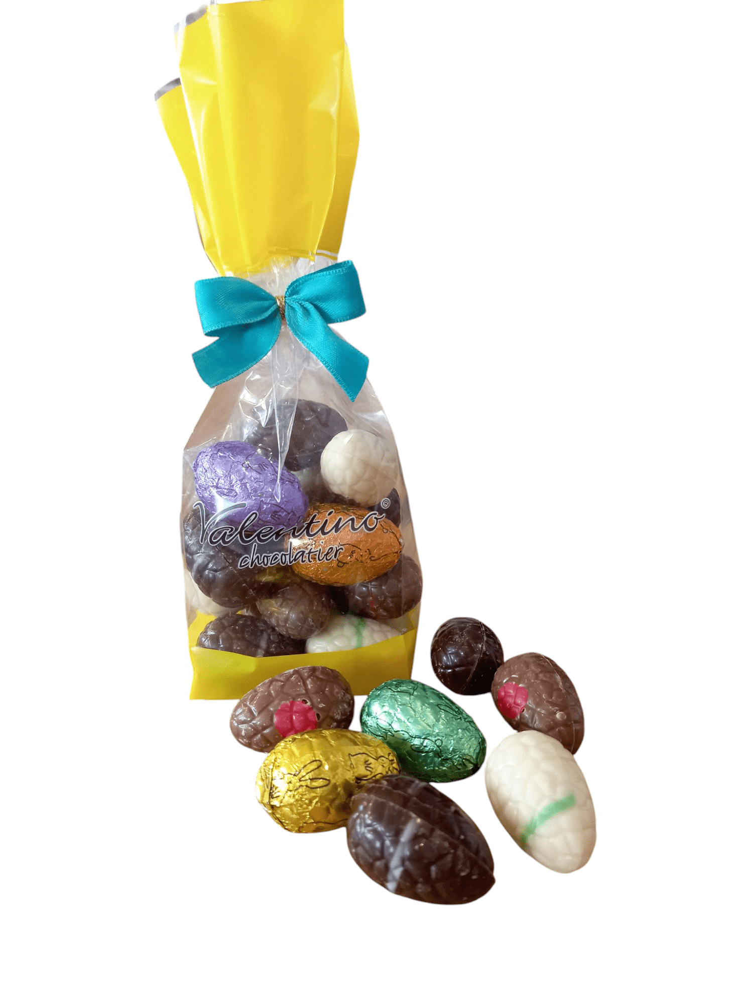 W tej ślicznej torebce zamkniętej gustowną, turkusową kokardką znajdziesz kompozycję pysznych czekoladowych jajeczek. Pod warstwą wybornej białej, mlecznej lub ciemnej belgijskiej czekolady kryją się nadzienia waniliowe, karmelowe, orzechowe, malinowe, pistacjowe i wiele innych. Jajeczka są tak pyszne, że nie sposób poprzestać tylko na jednym.