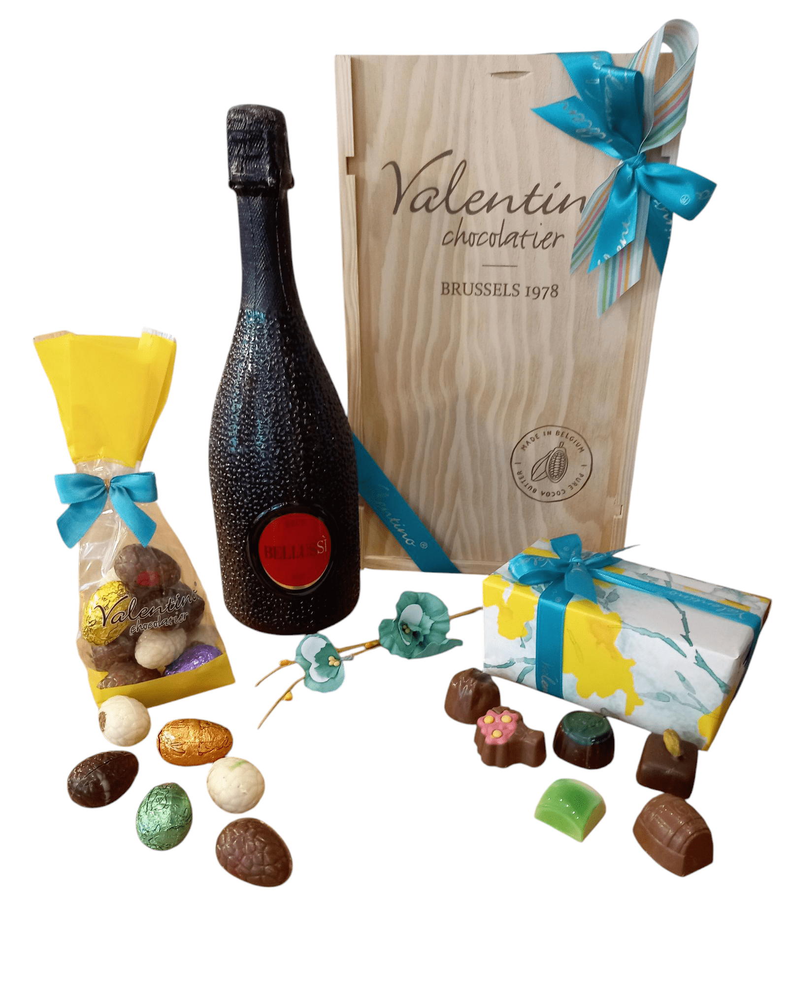 Zestaw prezentowy zawierający belgijskie słodycze oraz włoskie wino, przygotowany z najwyższą dbałością o detale, to idealna propozycja na oryginalny wielkanocny upominek.