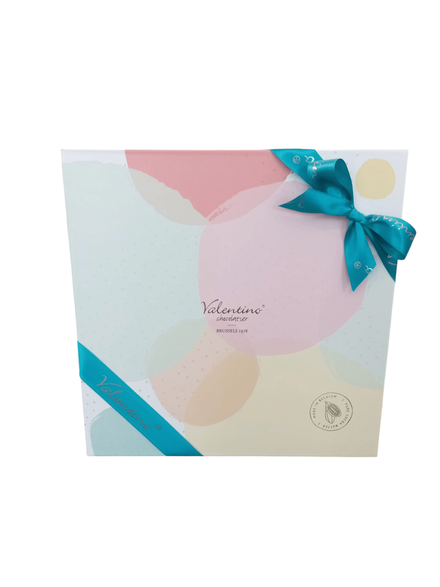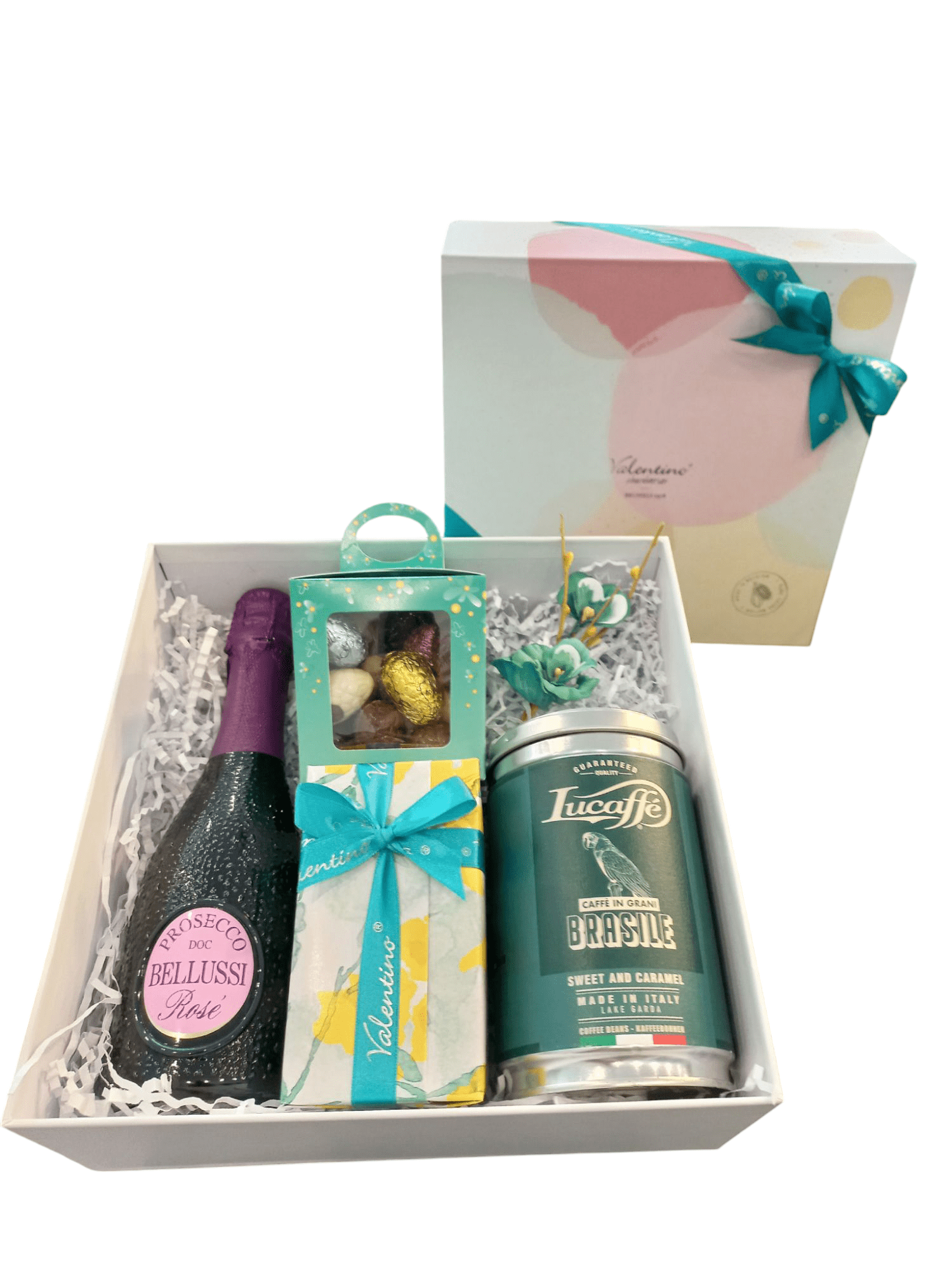 Ta bogata kompozycja umieszczona została w gustownym pudełku Valentino Chocolatier. Ozdobne pudełko prezentowe utrzymane w pastelowych odcieniach ozdobione zostało turkusową wstążką i piękną kokardką.
