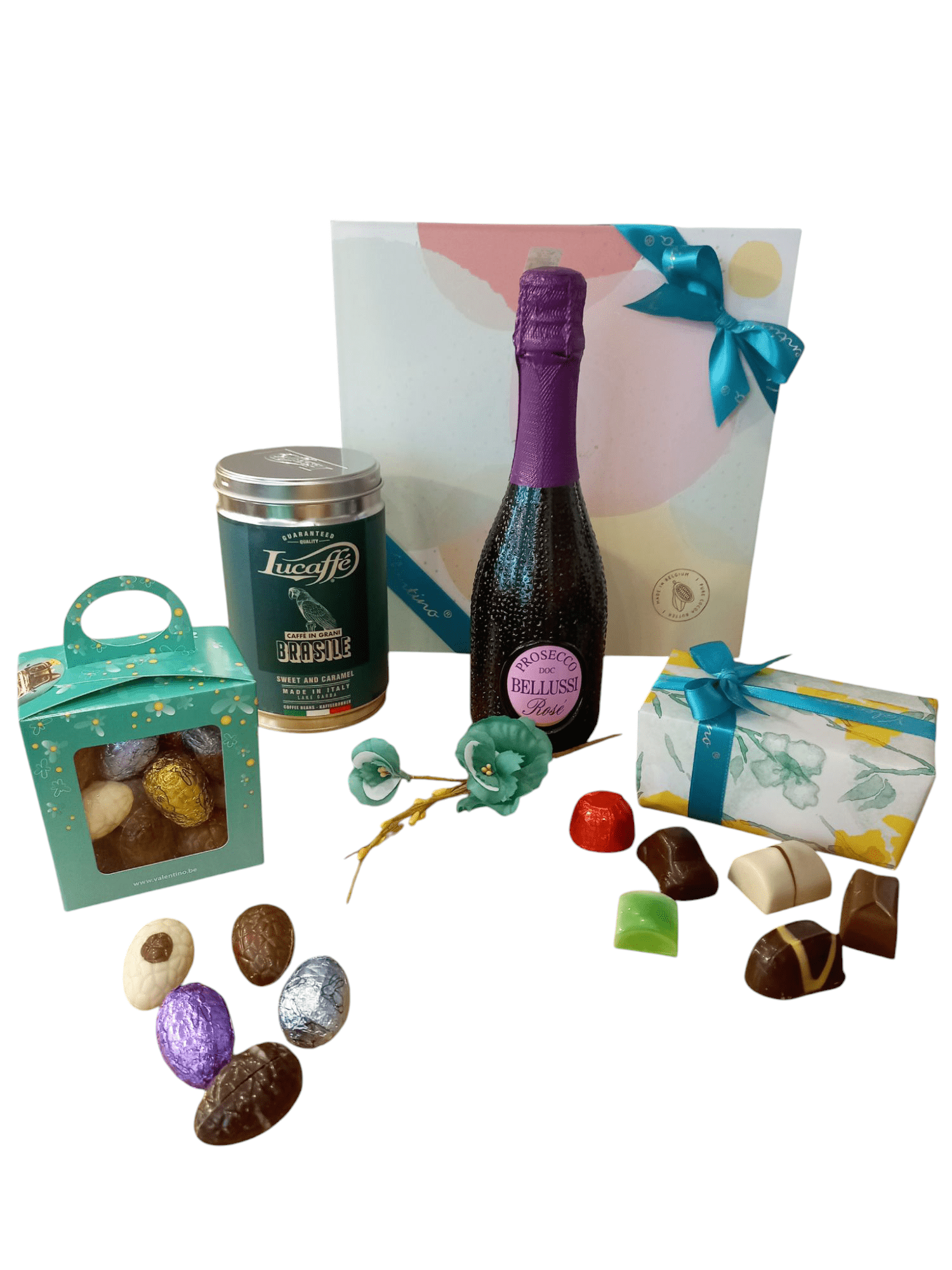 Zestaw prezentowy zawiera śliczne, wielkanocne pudełko z okienkiem wewnątrz którego znajdują się różnorodne czekoladowe jajeczka (250 g, tj. ok. 20 sztuk). Pod warstwą ciemnej, mlecznej i białej belgijskiej czekolady kryją się nadzienia waniliowe, karmelowe, orzechowe, malinowe, pistacjowe i kawowe. W pudełku prezentowym umieściliśmy również balotynkę (czyli klasyczne belgijskie pudełeczko) w ozdobnym papierze w wiosenne kwiaty, która wypełniona jest piękną kompozycją belgijskich pralin (220 g, tj. ok. 16 pralin). Czekoladki leżą na dwóch warstwach, oddzielonych delikatną, złotą przekładką. Każdą warstwę wypełniają starannie wyselekcjonowane pralinki, które zachwycają ciekawym kształtem i wyśmienitym smakiem. Wewnątrz zestawu znajdziemy również znakomitą włoską kawę Lucaffe Brasile, o delikatnym czekoladowym aromacie, orzechowych tonach i słodkim karmelowym posmaku zapakowaną w elegancką, metalową puszkę (250 g). Całość prezentu dopełnia różowe, włoskie wino musujące Bellussi Prosecco DOC Rosé (0,375 l, 11,5%) – wytrawne, pachnące nutami małych, czerwonych owoców oraz cytrusów. Wyprodukowane w Wenecji Euganejskiej ze starannie wyselekcjonowanych winogron Glera i Pinot Nero.