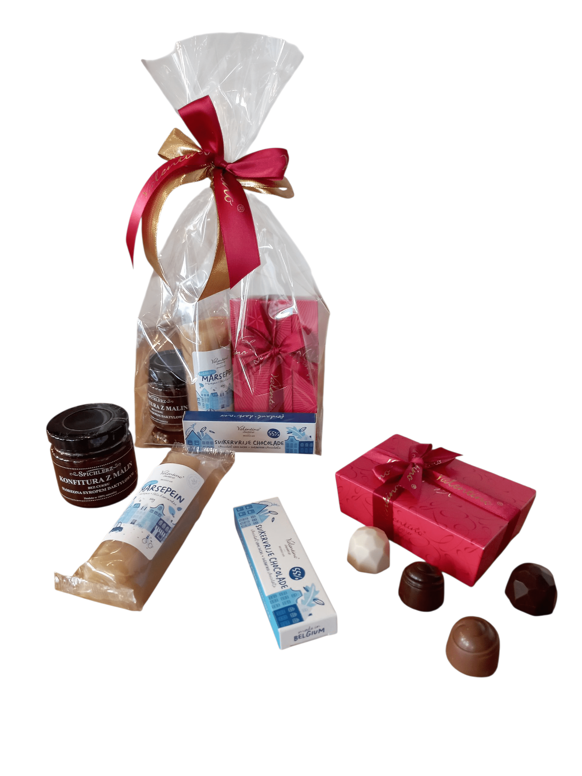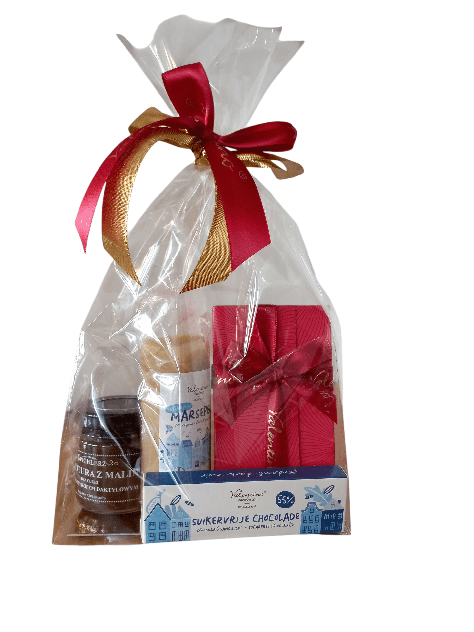 Zestaw prezentowy zawierający belgijskie słodkości oraz tradycyjną konfiturę malinową, bez dodatku cukru, to wyjątkowy upominek dla diabetyków, na różne okazje.