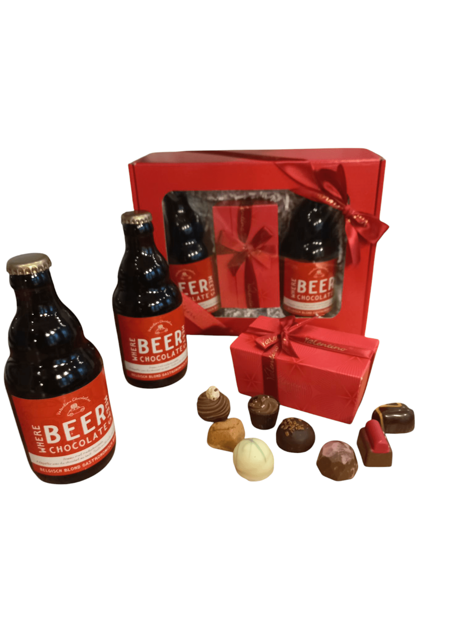Zestaw prezentowy „Gdzie piwo spotyka się z czekoladą” zawiera belgijskie czekoladki w towarzystwie dwóch butelek belgijskiego piwa. Ten zestaw to ciekawa propozycja na oryginalny upominek.