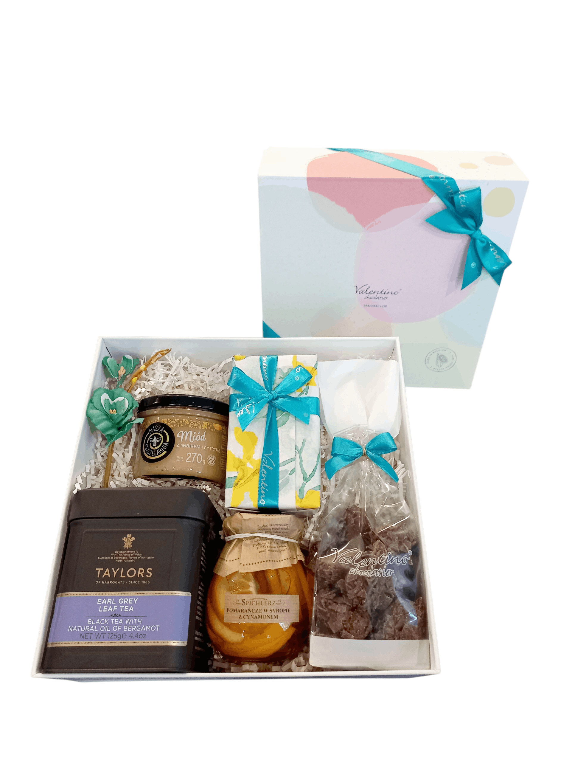 Ta bogata kompozycja umieszczona została w gustownym pudełku Valentino Chocolatier. Ozdobne pudełko prezentowe utrzymane w wiosennych, pastelowych odcieniach ozdobione zostało turkusową wstążką i piękną kokardką.