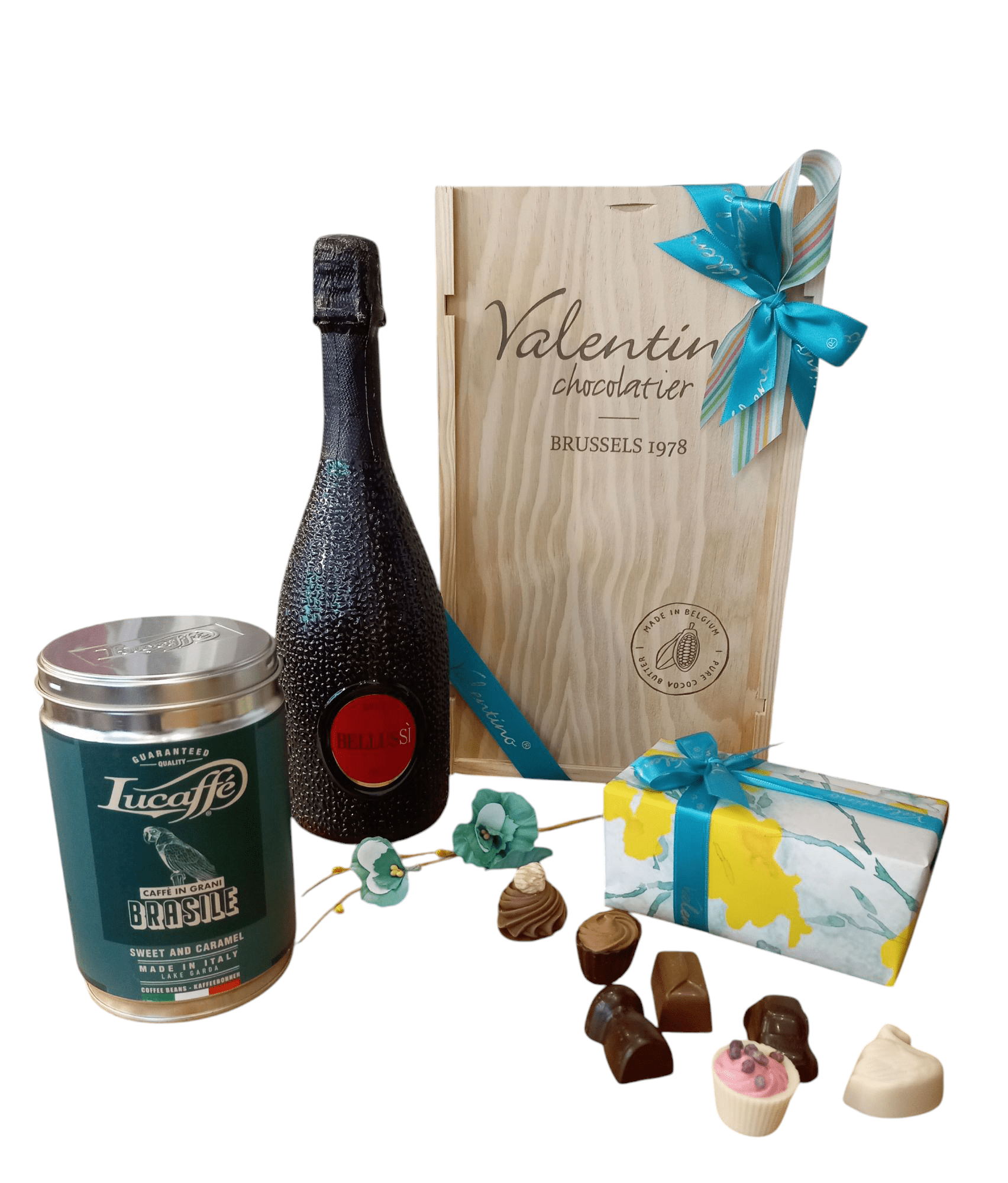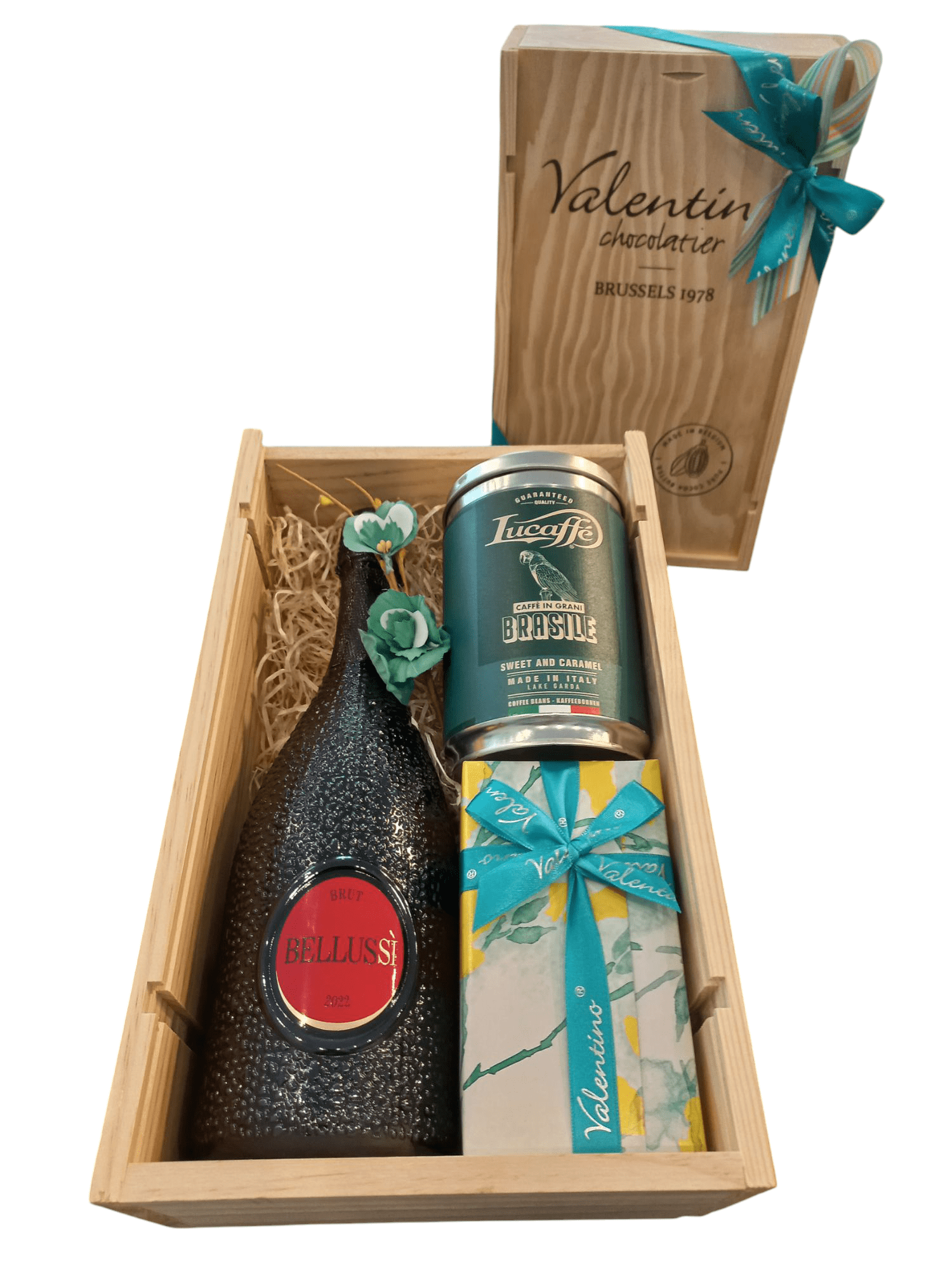 Zestaw prezentowy zawierający belgijskie słodycze oraz włoskie wino i włoską kawę, przygotowany z najwyższą dbałością o detale, to idealna propozycja na oryginalny upominek.