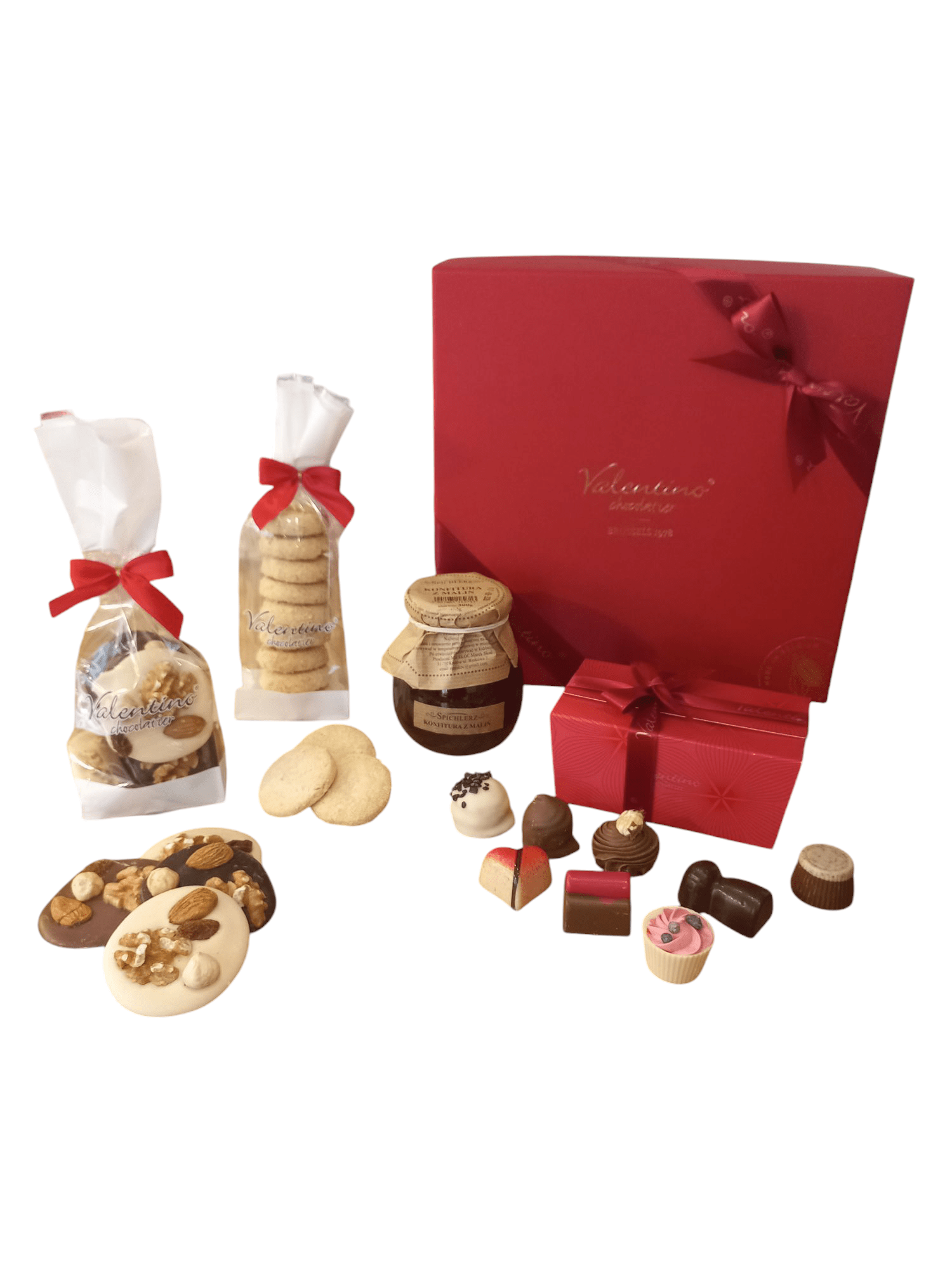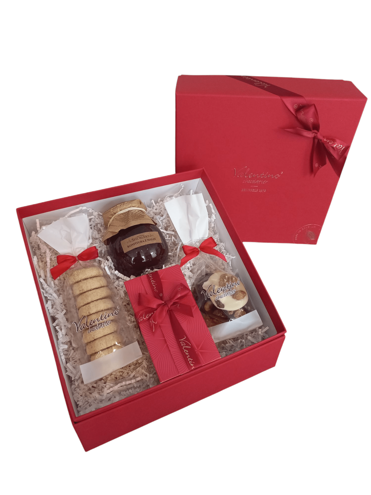 Ta słodka kompozycja umieszczona została w gustownym czerwonym pudełku Valentino Chocolatier. Całość prezentu ozdabia czerwona wstążka i piękna kokardka.
