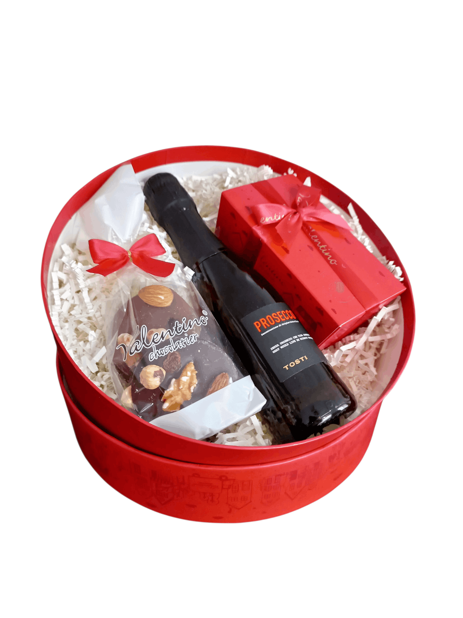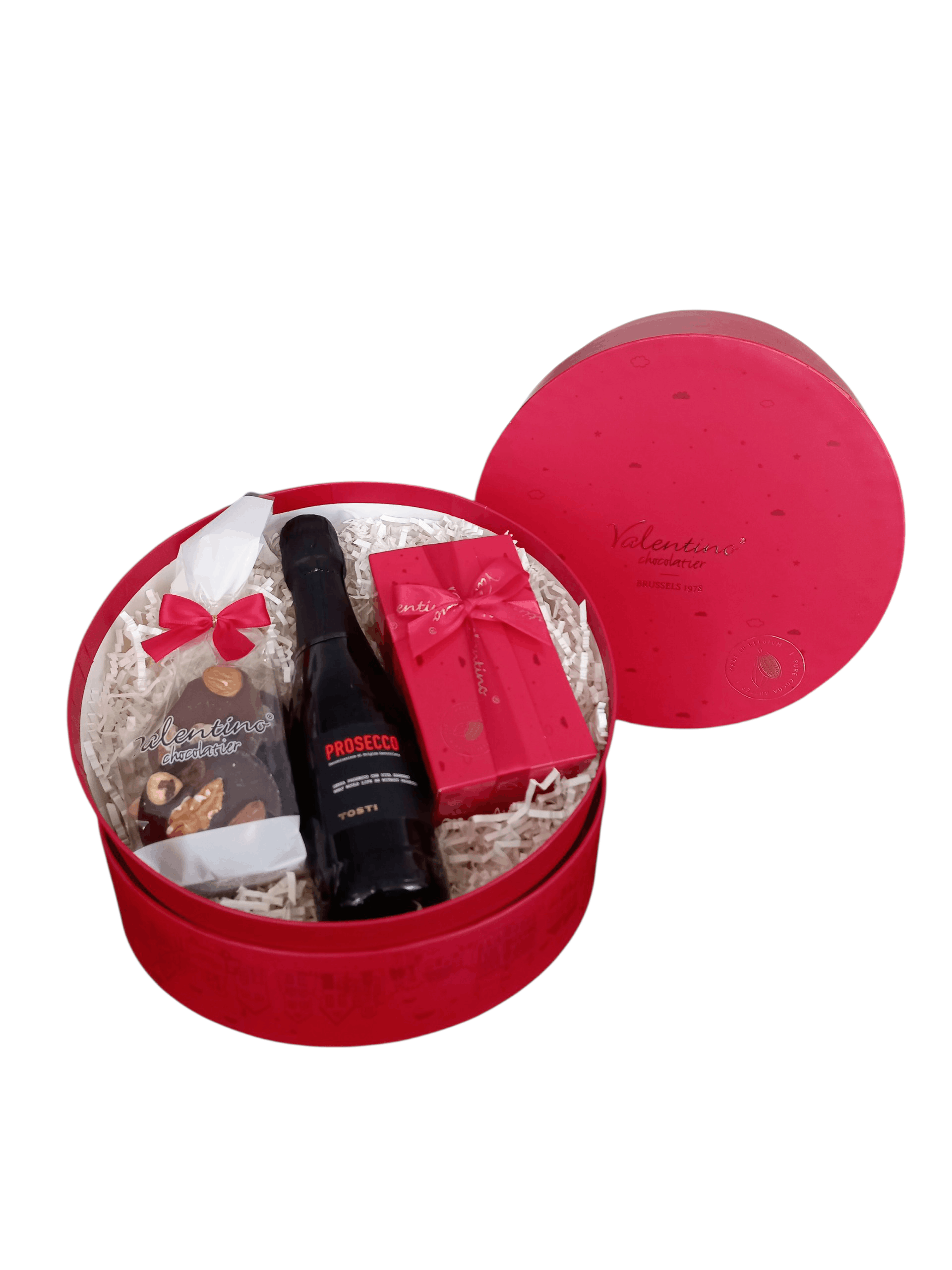 Ta piękna kompozycja umieszczona została w gustownym, okrągłym, czerwonym pudełku Valentino Chocolatier.
